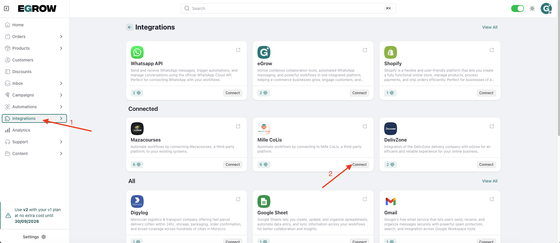A success message will appear confirming that Mille Colis has been successfully integrated with your eGrow account.