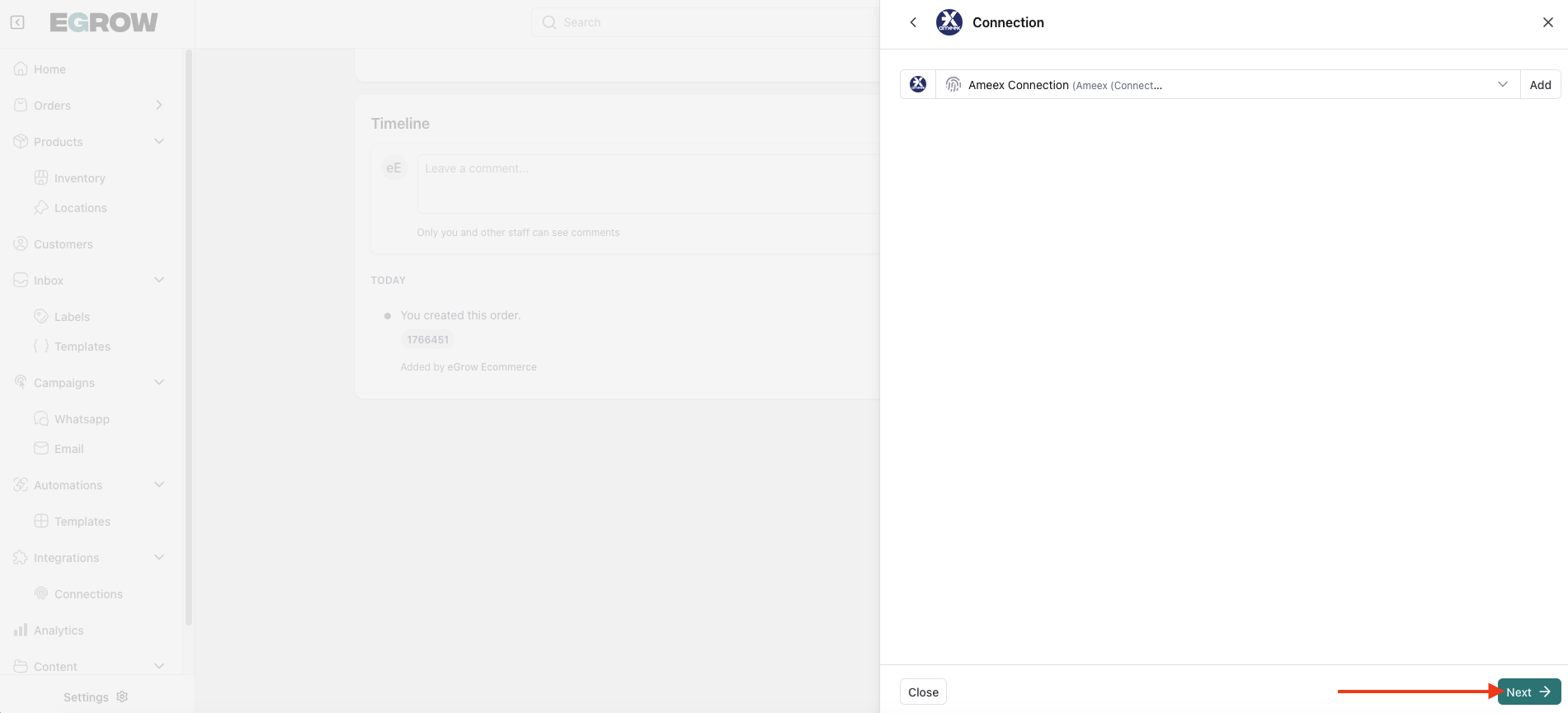 Select the Ameex connection you previously added (API integration)