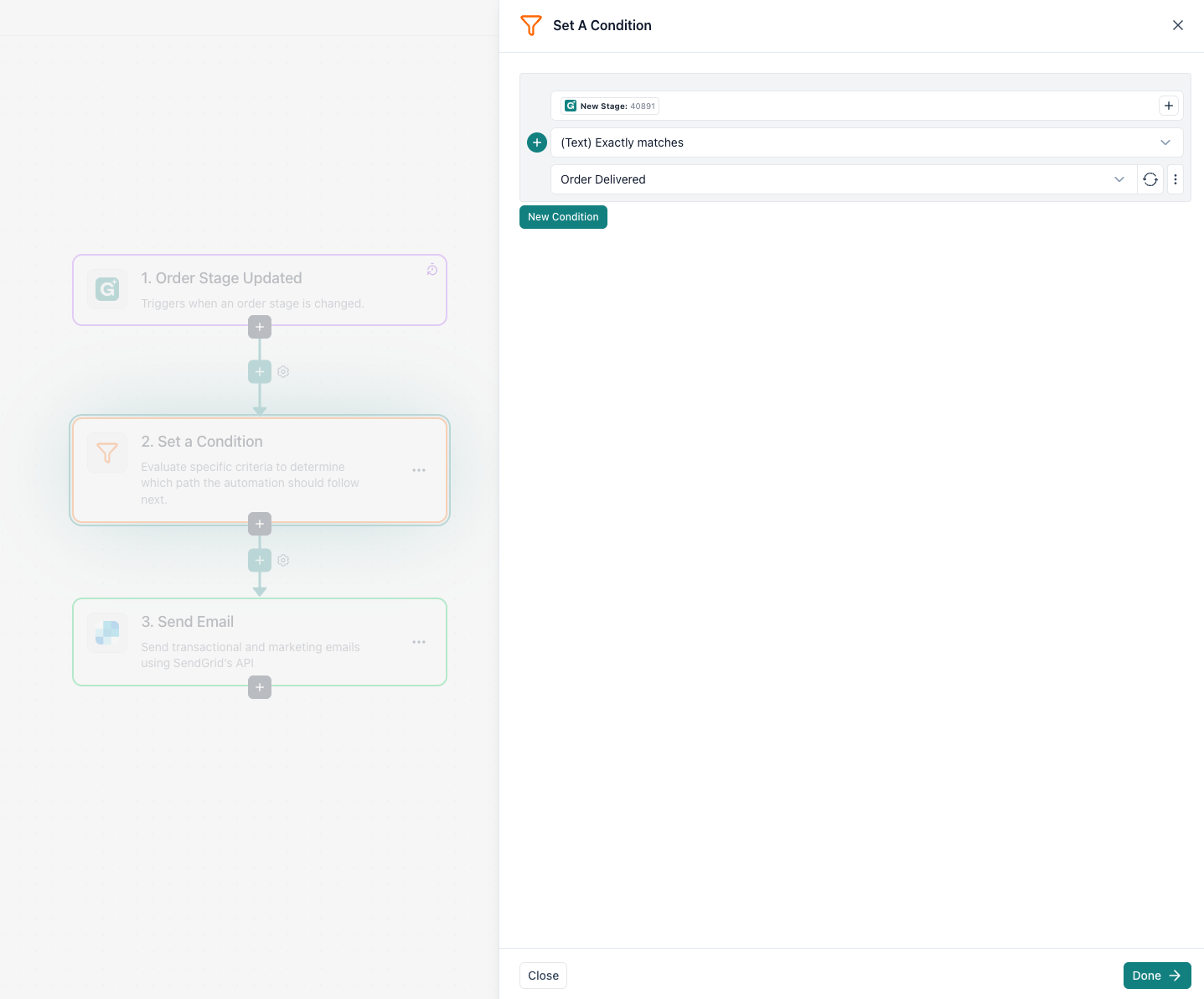 The automation will continue only if the order’s new stage is exactly “Order Delivered”.