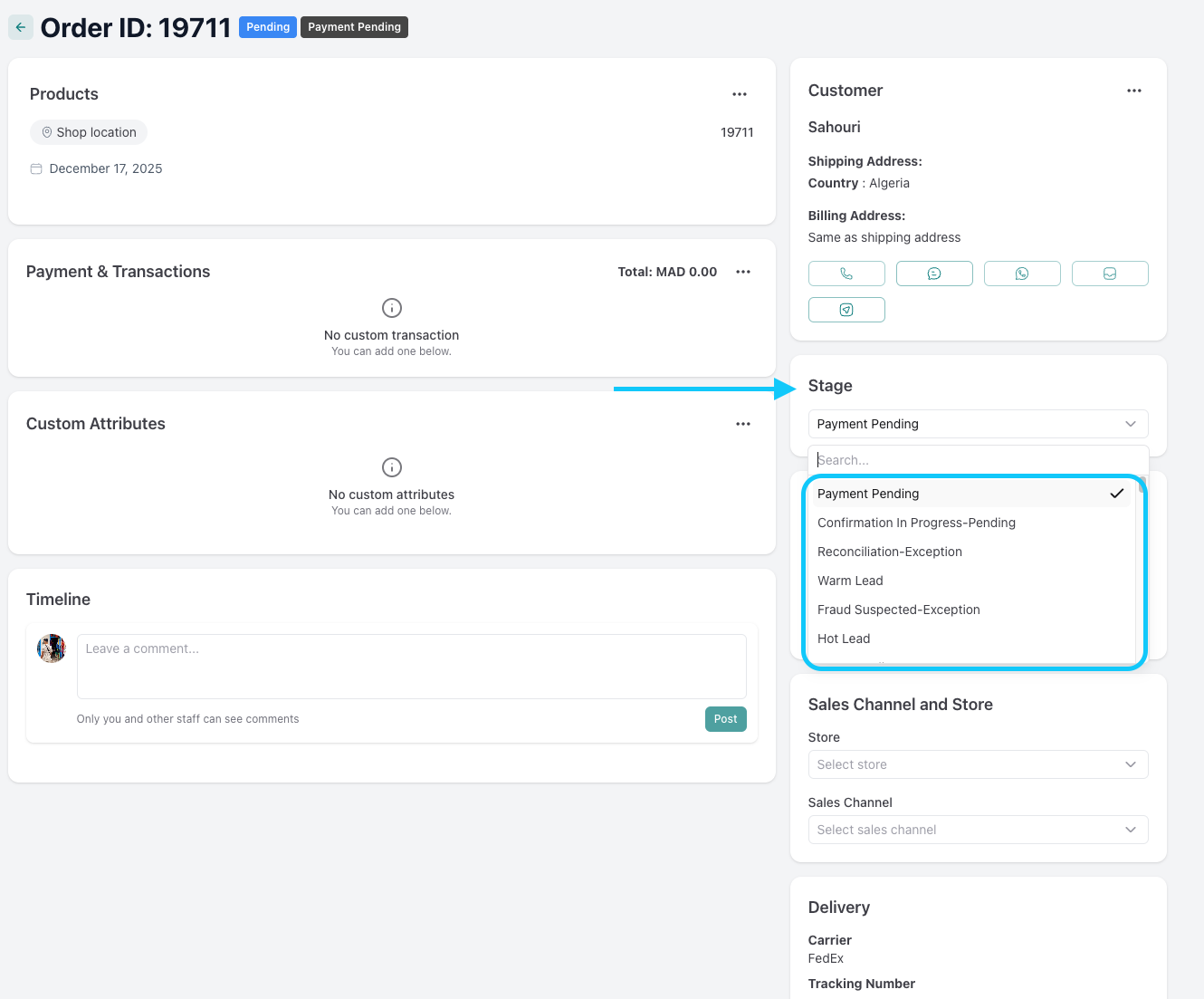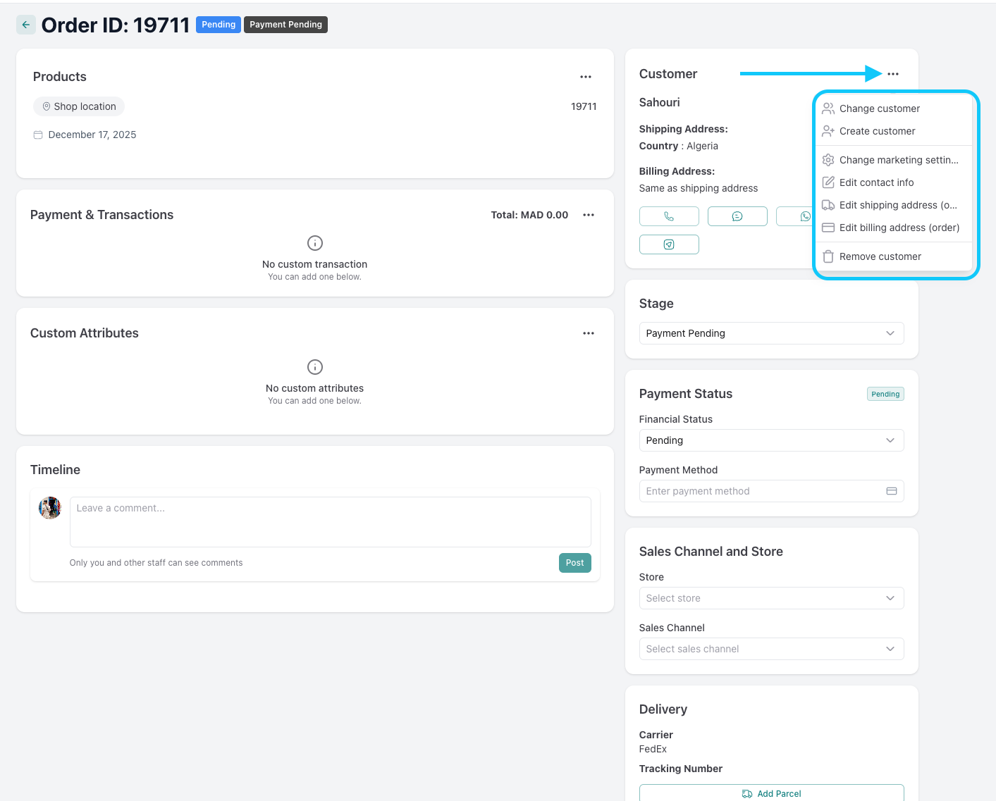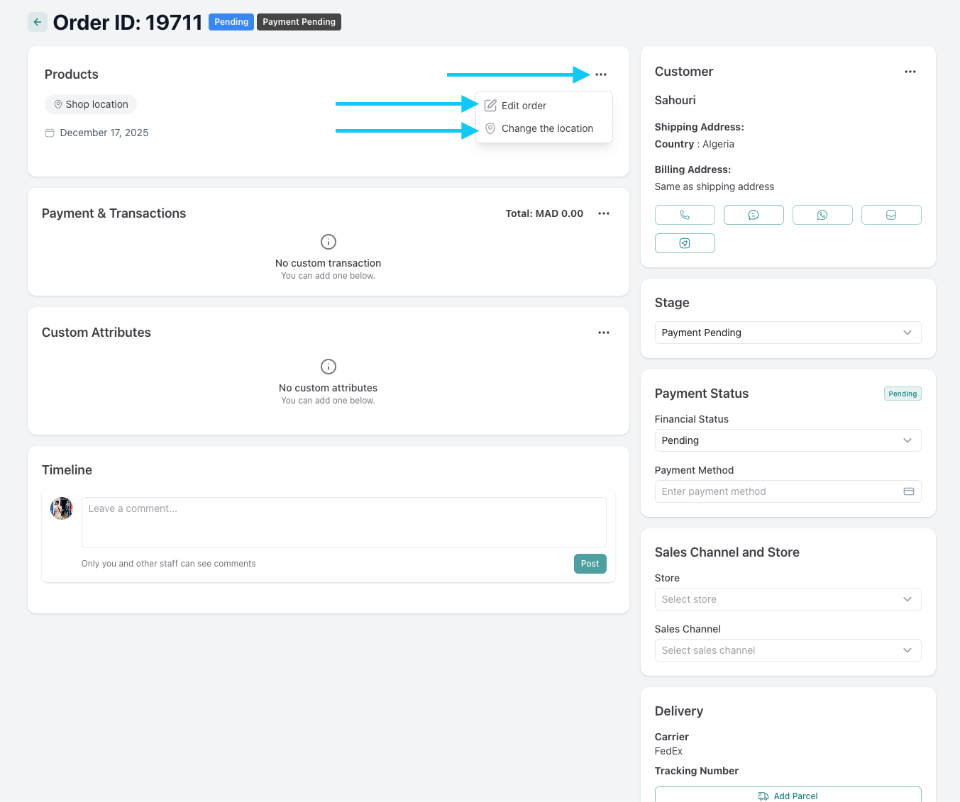 change the payment status, sales channel, store and delivery informations from the sections displayed bellow
