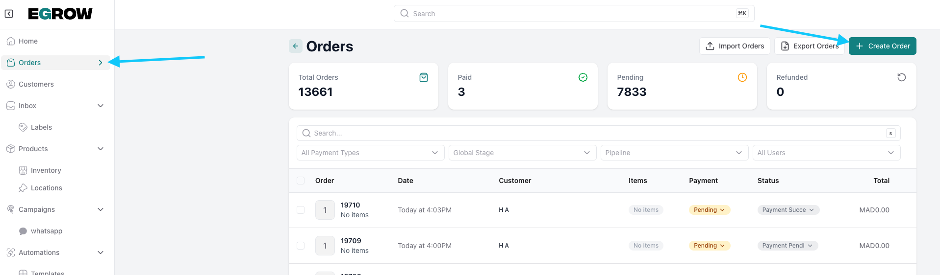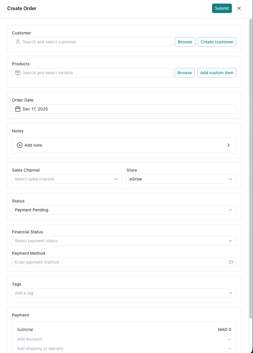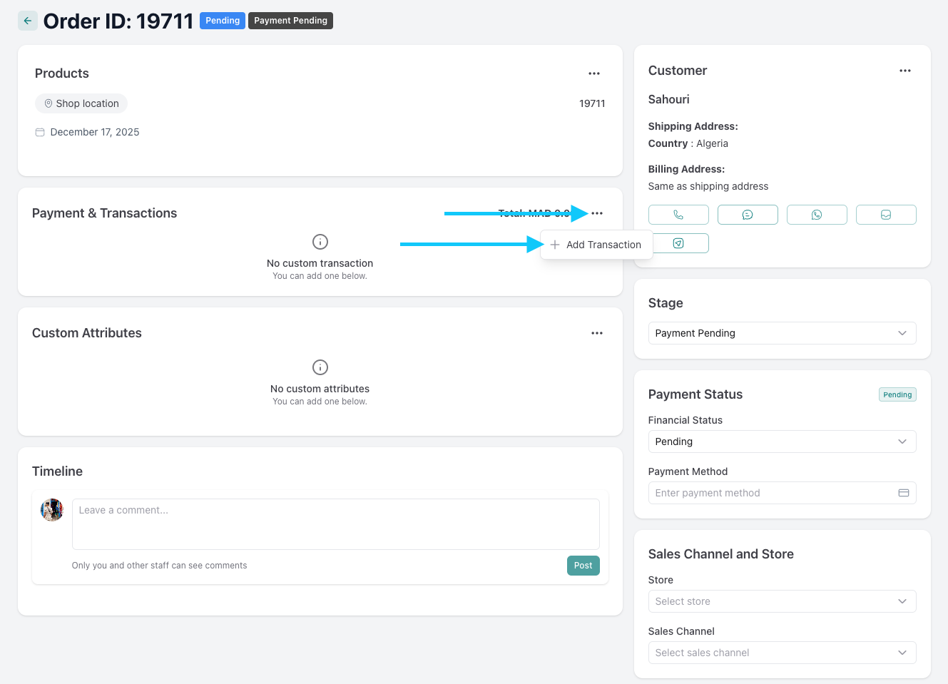 change the payment status, sales channel, store and delivery informations from the sections displayed bellow